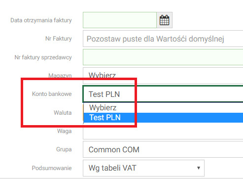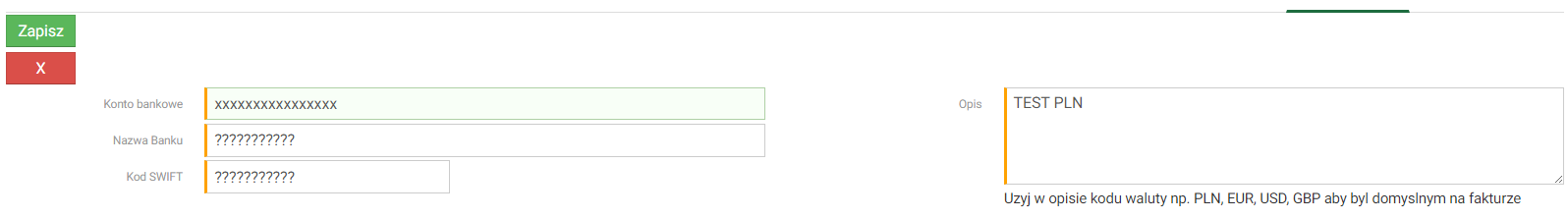 Wypełnij dane. Pole opis jest o tyle istotne, że pojawia się potem przy wyborze konta na fakturze zakupu. Warto wpisać zgodnie z podpowiedzią walutę do którego konto jest przypisane. Dzięki temu system odpowiednio automatycznie podpowie numer konta. Jeśli waluta nie jest wpisana w opisie, to system nie podpowiada automatycznie numeru konta.